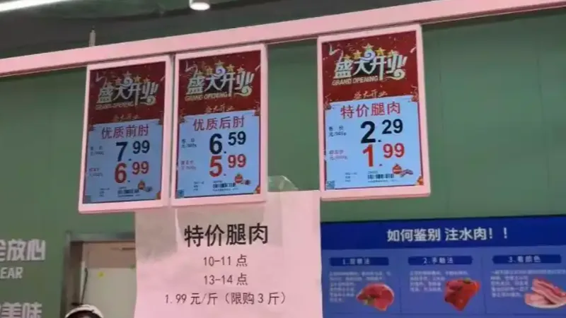 近日,不少地方的猪肉价格都出现了“跳水”现象。一位来自沈阳的消费者表示,当地一家超市推出秒杀活动,优惠下来特价猪腿肉低至1.99元/斤,每人限购3斤。