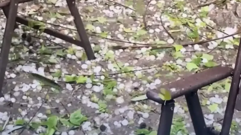 3月29日,贵州荔波县小七孔景区遇强对流天气,降下如石头般大小的冰雹。有游客用纸壳遮挡头部躲避,部分区域树叶被冰雹击落一地。景区工作人员回应称,冰雹持续一段时间后已停止,目前景区正常开放,未接到游客受伤送医的报告。