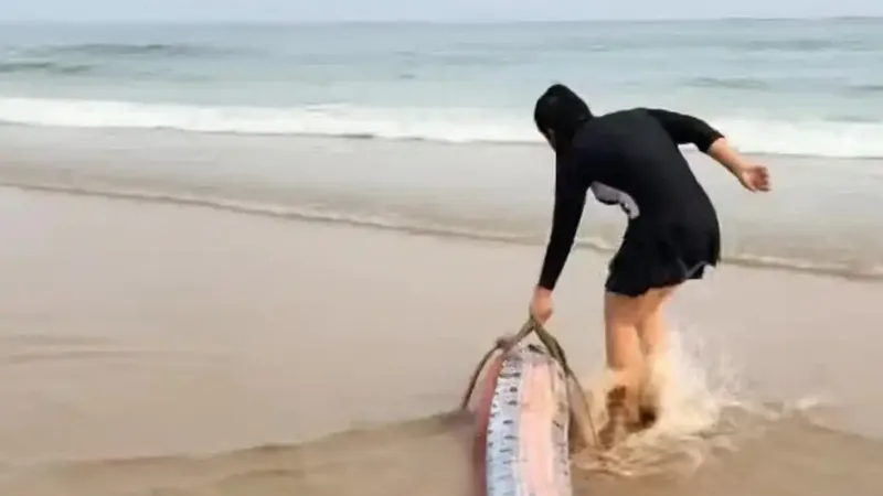 4月2日18时许,海南陵水清水湾沙滩出现一条搁浅皇带鱼,目测长度超3米,游客尝试将其拖回深水区未果。该鱼因濒临死亡且非保护动物,未报警处理。