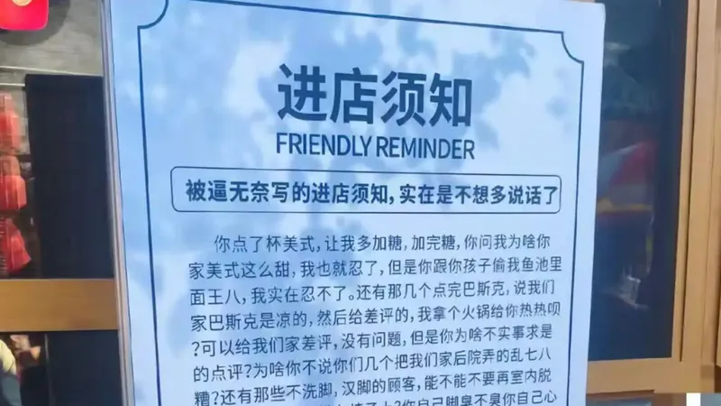 近日,山东潍坊青州古城一家咖啡店的进店须知在网络上引发热议。这份长达700字的须知,除了常规的“禁止室内吸烟”“禁止室内打牌”外,还出现了“禁止乱扔丝袜”“禁止室内捞小乌龟”等小众规定,还出现了不少错别字,令不少网友感到好奇,也引来不少网友共情老板。