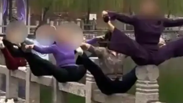 4月10日,五名女子在河南省新乡市百泉风景区临水石栏杆上表演高难度瑜伽动作,双腿悬空打开引发安全争议。景区工作人员表示将重点巡查并制止此类危险行为。