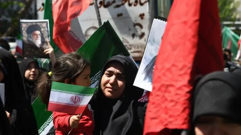 当地时间4月9日,在德黑兰的共和国大街上,数万民众从城区各处汇聚而来。人们挥舞伊朗国旗,手持哈梅内伊与现任最高领袖穆杰塔巴的画像,高呼口号反对美以打击伊朗。