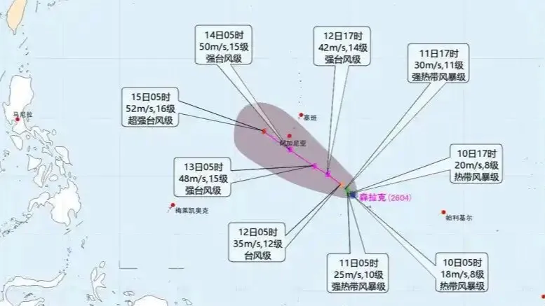 4月10日,今年第4号台风“森拉克”(热带风暴级)的中心位于美国关岛东南方向约820公里的西北太平洋洋面上,中心附近最大风力有8级(18米/秒),预计,“森拉克”将原地少动,强度逐渐增强。