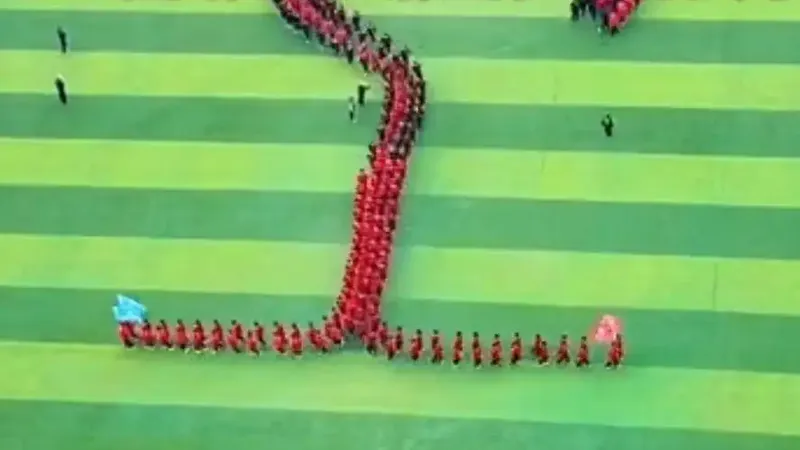 4月10日,石家庄裕华区第24届中小学生田径运动会开幕式上,400名初中生以真人版“贪吃蛇大作战”形式表演,来自石家庄市第四十四中学初一8个班的学生经过一周排练,完成时长9分半的丝滑走位表演,加速处理的视频获数万点赞。