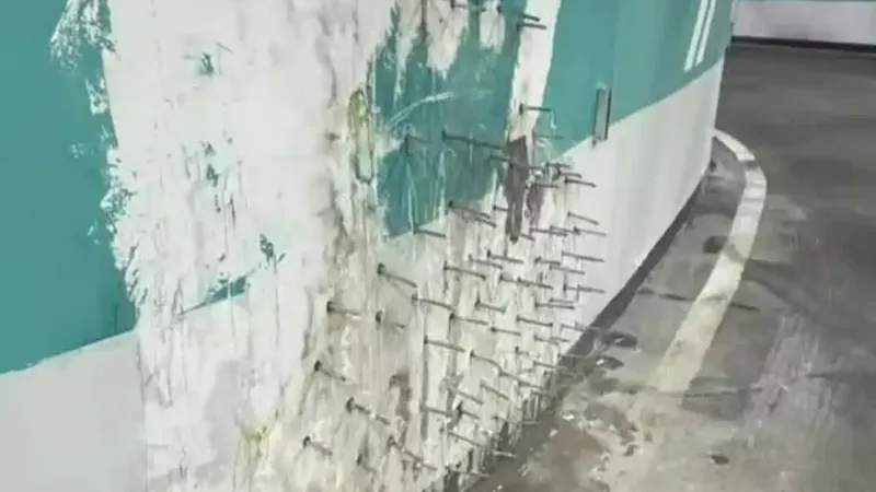 近日,有市民反映,在上海真如环宇城MAX商场停车场入口处的弯道,有夸张的“钉墙”,怀疑是商场防止车辆剐蹭保护墙面的措施。13日,记者向该商场管理方核实到,市民所称的“钉子”,实际是用于结构补漏的“注浆针”,该处补漏工程将于本周完成。