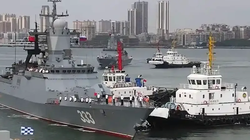 由俄罗斯海军“完美”号、“凛冽”号护卫舰和“佩琴加”号中型油船组成的舰艇编队15日上午抵达广东湛江,开始为期5天的友好访问。中方举行了欢迎仪式,码头响起歌曲《喀秋莎》。