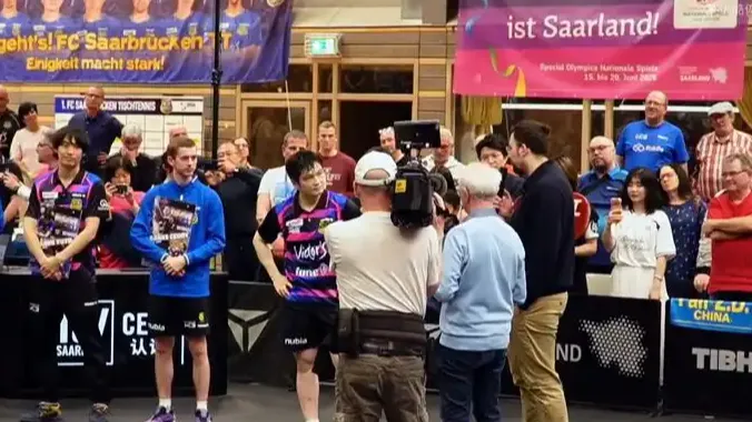 北京时间4月16日凌晨,乒乓球德甲联赛,萨尔布吕肯主场迎战云达不莱梅。此役,29岁的樊振东出场,拿下2分,帮助球队3-1取胜。赛后,球队为他举办了告别仪式。仪式上,樊振东用英文感谢球迷支持。