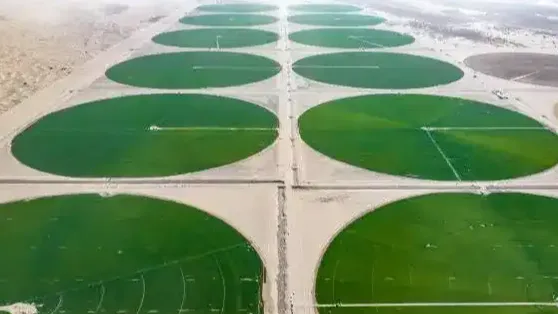 近日,塔克拉玛干沙漠种上了大片苜蓿,一抹浓淡相间的绿色圆形图案格外醒目,这是建设者以大地为画布,以庄稼为颜料,绘就的一幅绿色“同心圆”。