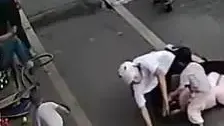 小孩突然窜出马路 骑车小伙舍己护娃