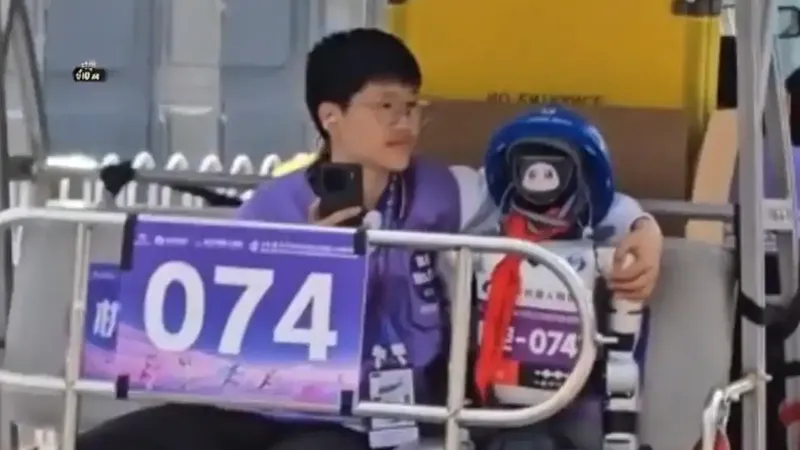 4月19日,人形机器人半马比赛现场出现可爱一幕,工程师搂着自家机器人坐车。网友:不管考得怎么样,爸妈都爱你。