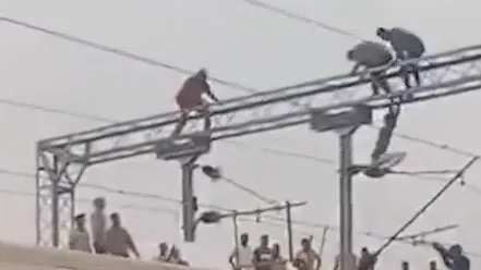4月17日,印度马哈拉施特拉邦曼马德火车站,一名身份不明的男子爬上高压电线杆,引发恐慌。救援人员攀爬上前对其拳打脚踢,男子扬言跳下。经近一小时,救援人��用绳索将其救下。列车服务中断,警方正确认其身份。​​​​